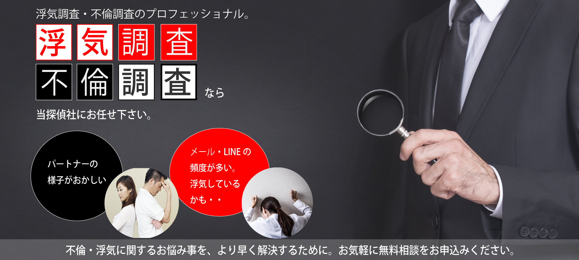 「全ての問題、別れさせ屋本舗が解決致します」別れさせ屋本舗では、裁判はもちろん、示談交渉(和解)を有利に進めるための確実な証拠集めに全力投球で調査を行っております。まずは「真実」を確認しましょう。